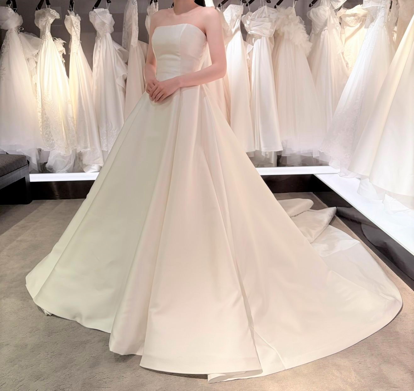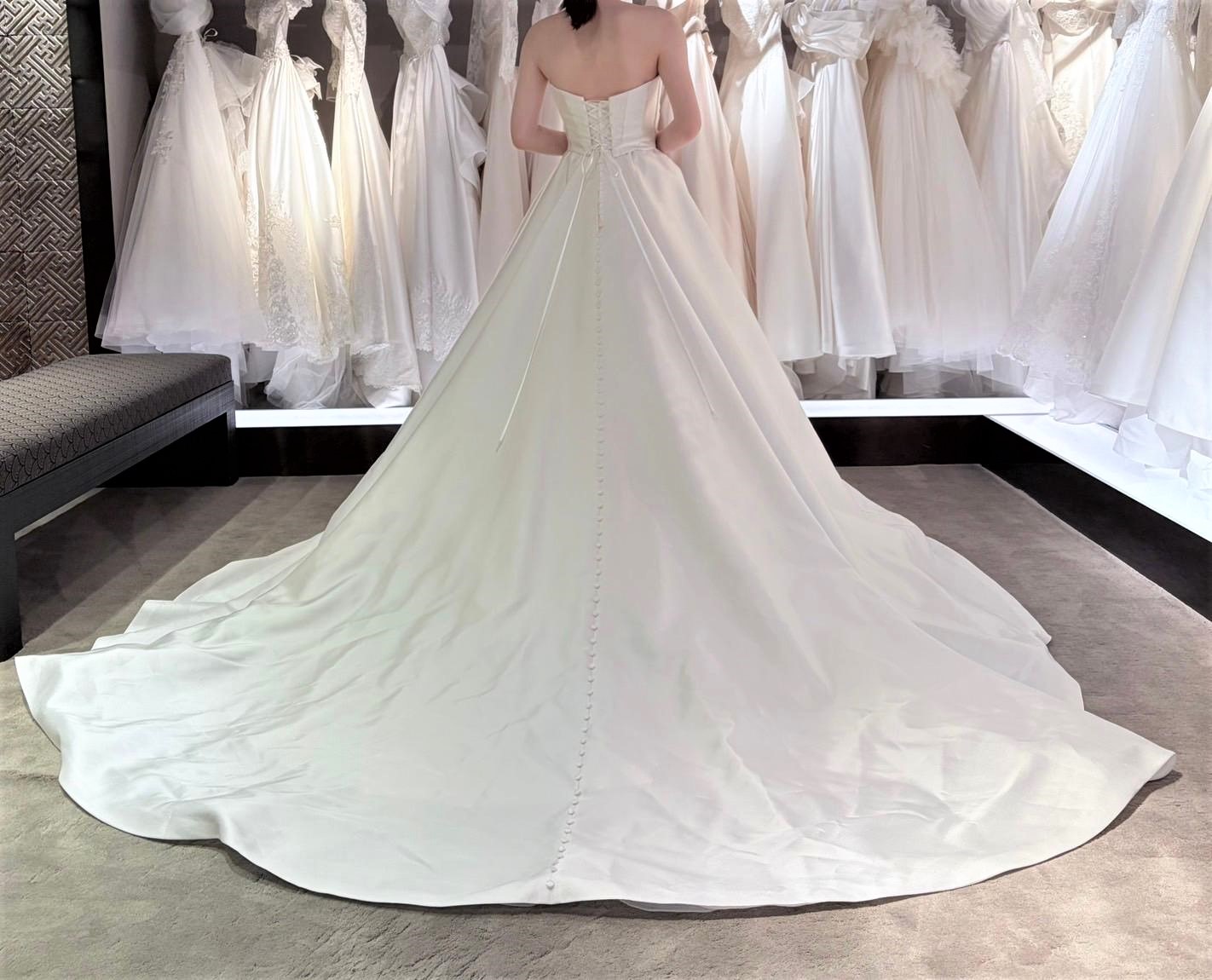 なめらかに広がるAラインのウエディングドレスでございます。